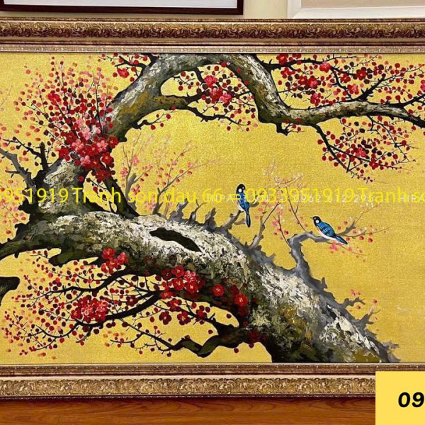 Tranh dát vàng cành mai đôi chim, tranh dát vàng sơn dầu cao cấp
