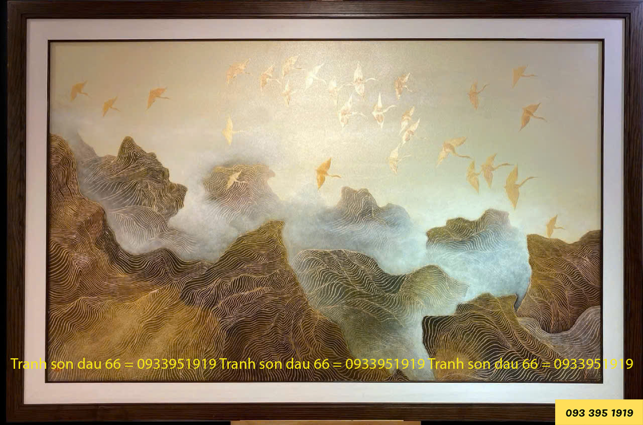Ánh vàng lấp lánh: Lớp vàng dát trên cánh chim hoặc một phần bầu trời giúp tranh nổi bật, bắt mắt ở mọi góc nhìn.