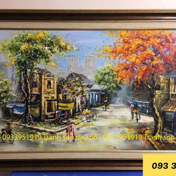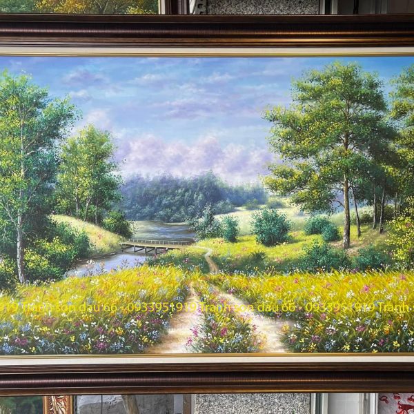 Bức tranh ruộng bậc thang với những ngôi nhà sàn lô nhô giữa cánh đồng rộng lớn. Nhìn từ xa, nhìn ảnh ruộng bậc thang giống như một dải lụa đang tung bay trước gió trải dài từ đỉnh núi, xuống chân núi. Bức tranh mô phỏng lại những thảm ruộng bậc thang uốn lượn trên các sườn đôi đẹp tới nao lòng. Tranh sơn dầu cao cấp, mực chuẩn nên tạo được độ sâu và sự sắc nét cho từng chi tiết.